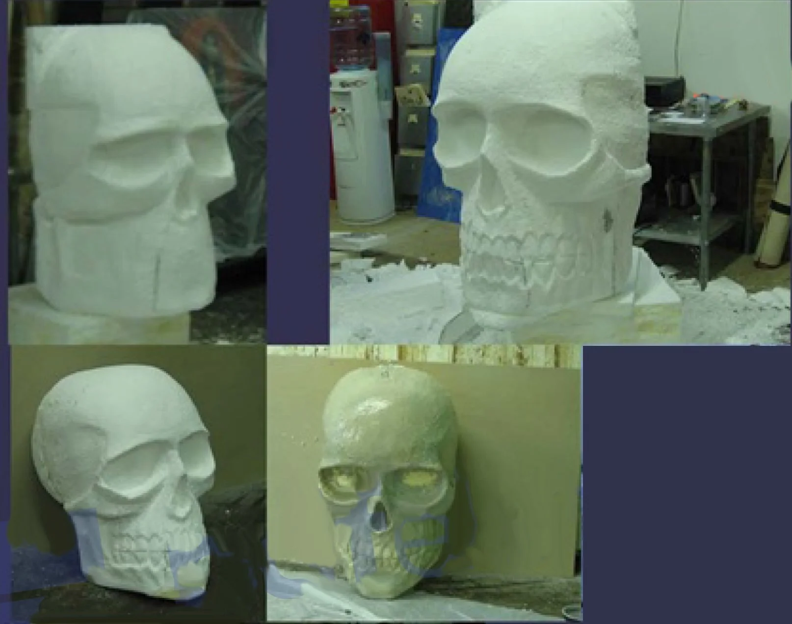 “Hanging Skull” — from initial sketch through build to finished piece. Originally created for the Voodoo Denim Lounge in Columbus, Ohio; current whereabouts now unknown.